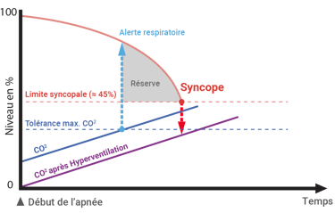 C'est pourquoi l'hyperventilation ne dois pas être pratiqué.Syncope ou blackout (point rouge)