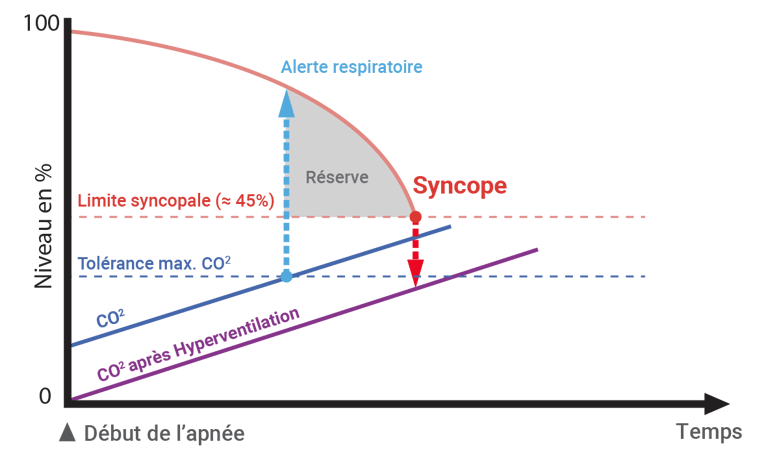 L'hyperventilation se produit quand on augmente la fréquence respiratoire associée à une inspiration fortement accentuée. Elle a pour conséquence une augmentation de l'oxygénation et une diminution du gaz carbonique. Il faut savoir que l'hyperventilation ne modifie pas le niveau de saturation d'oxygène dans le sang, mais elle diminue sa teneur en CO₂. Comme c'est l'accumulation du niveau de CO₂ qui informe du besoin de respirer, un faible niveau retarde donc cet avertissement qui peut entrainer un black out, comme le montre la courbe violette.